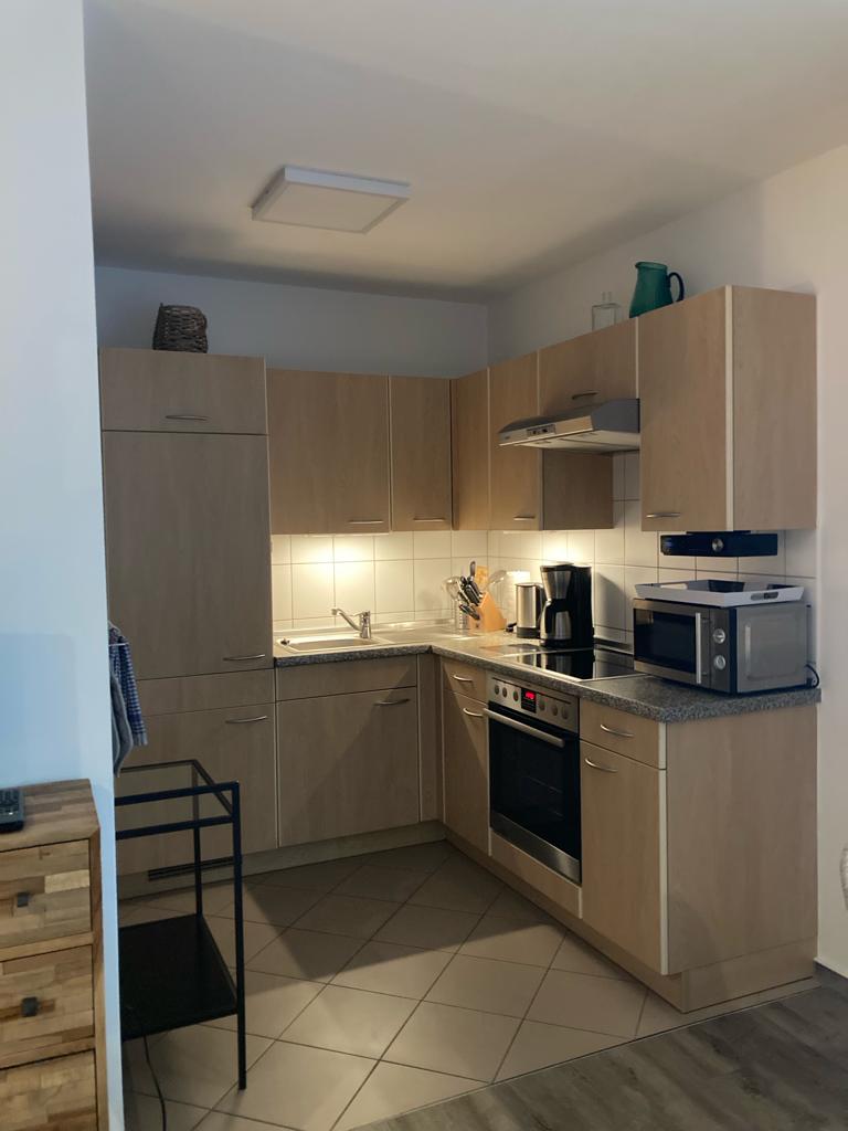 Küche: vollständig eingerichtet, Herd mit Ceranfeld, Dunstabzugshaube, Backofen, Kühlschrank mit Gefrierfach, Kaffeemaschine, Mikrowelle, reichhaltig bestückt mit Gläsern und Geschirr für Mahlzeiten - im Sommer auch auf der Terrasse - die Zutaten, wie frischen Fisch, bekommen Sie täglich auf dem Markt am Alten Strom.