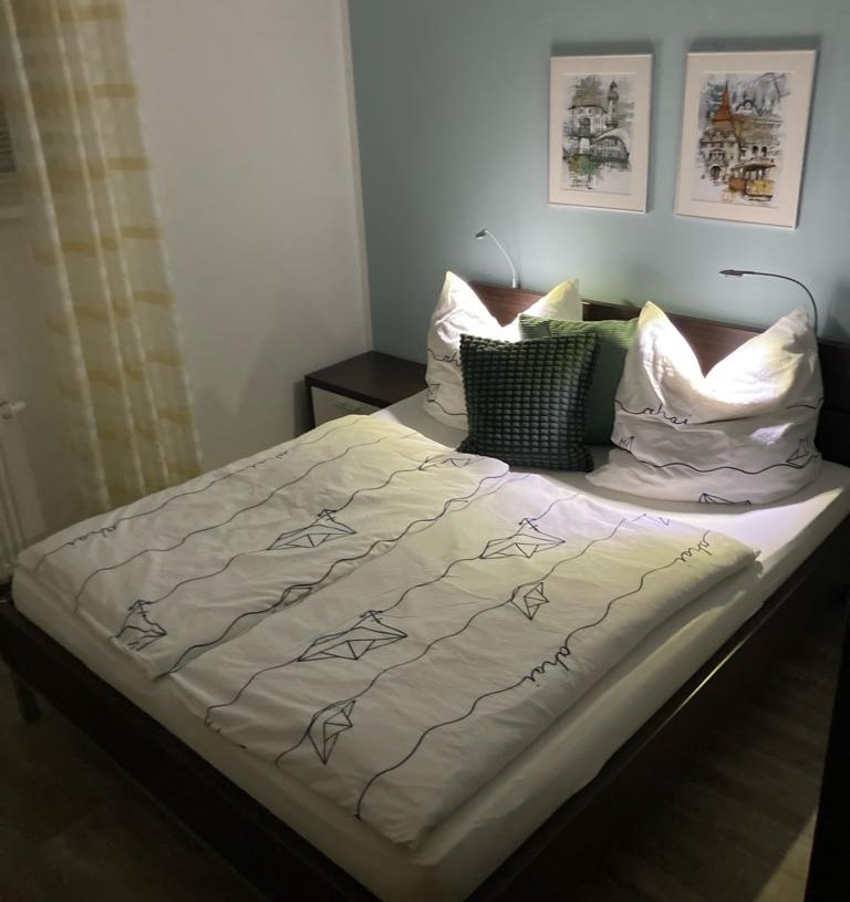 Schlafzimmer: Doppelbett mit einstellbarem Lattenrost, großer Kleiderschrank, Buchenlaminat.